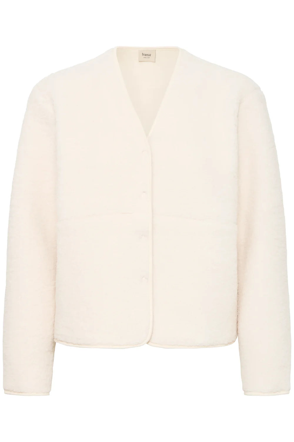 Die Fransa Gwynne Bouclé-Jacke hat einen V-Ausschnitt,