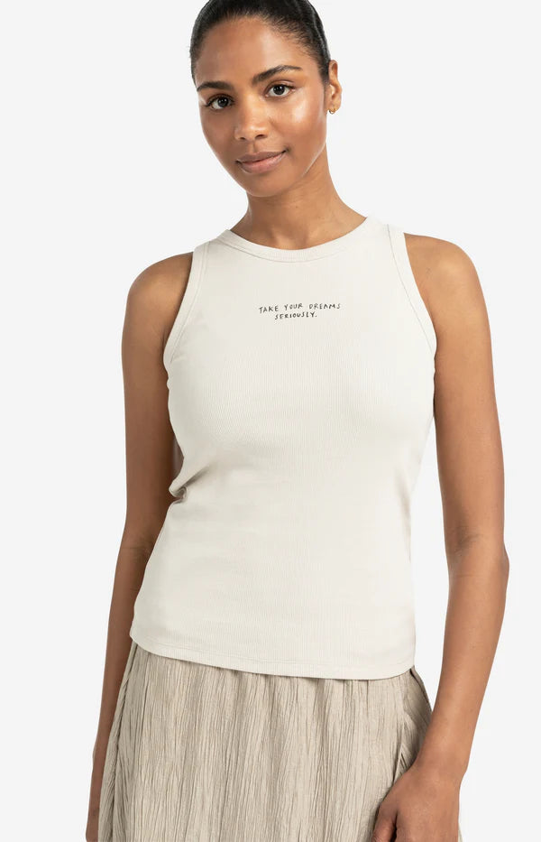 Dieses stylishe gerippte Oberteil aus einer weichen Baumwollmischung hat eine eng anliegende Passform. Der Rundhalsausschnitt und das ärmellose Design sorgen für einen zeitlosen Look. Der dezente Text auf der Vorderseite verleiht dem Oberteil eine verspielte Note. Es ist die perfekte Wahl für ein lässiges Outfit oder als Teil eines Lagenlooks unter einer Jacke. Das Model ist 176 cm groß und trägt Größe S.