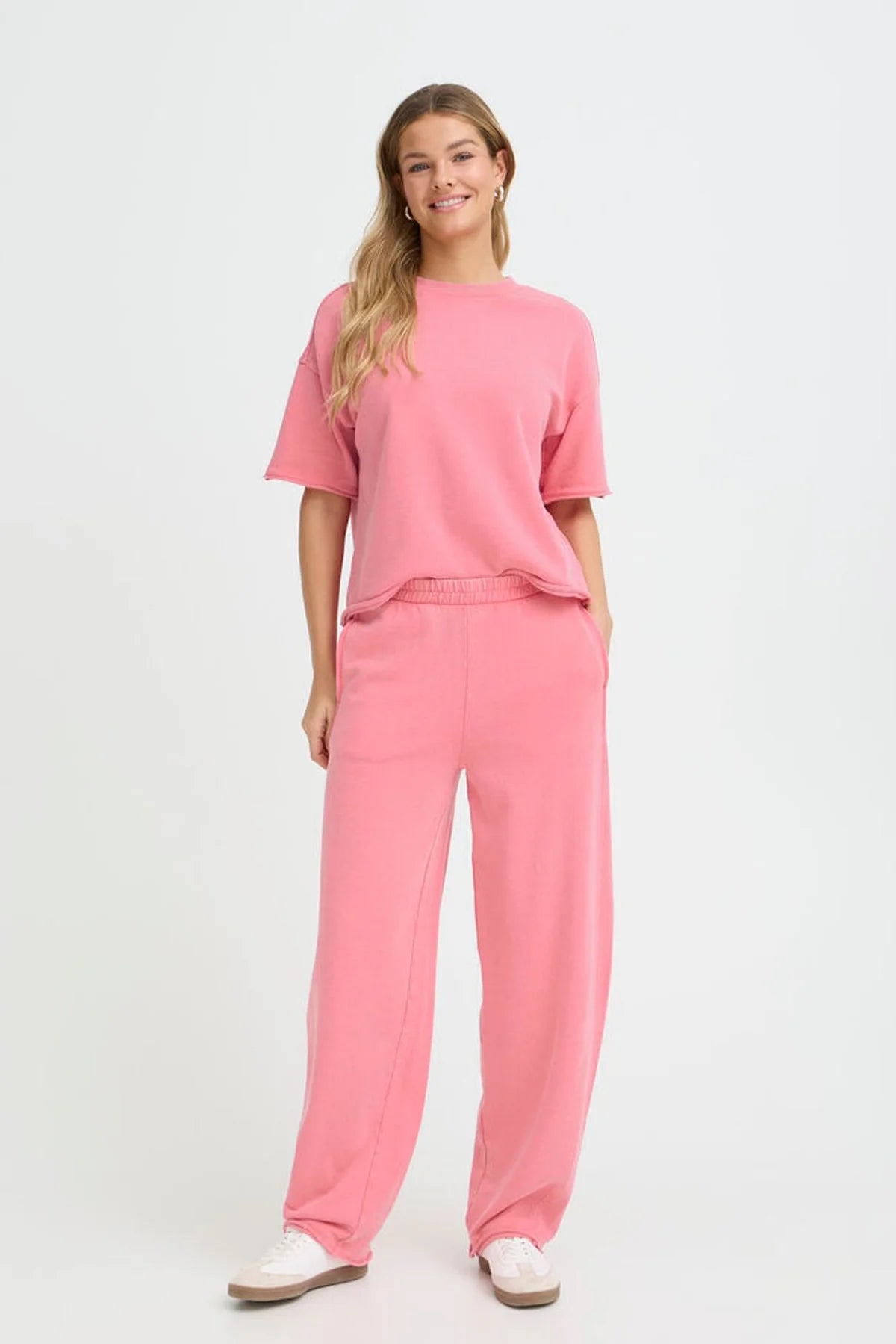 Mit einem elastischen Bund für ganztägigen Komfort, einer entspannten geraden bis breiten Beinsilhouette und sauberen, minimalistischen Details schaffen sie einen schmeichelhaften Draper, der modern und tragbar wirkt. Der sanfte Rosaton verleiht eine frische, selbstbewusste Energie, bleibt aber in einer Kapselgarderobe einfach zu stylen.