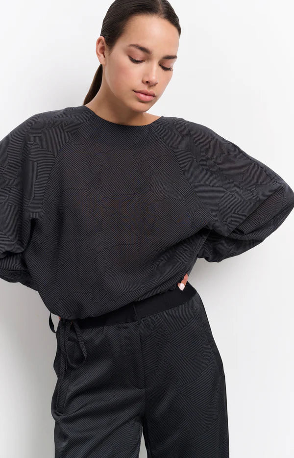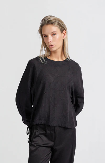 Dieses elegante Oberteil aus fließendem Stoff mit einem dezenten Muster hat eine bequeme, lockere Passform. Die langen Ärmel, der Rundhalsausschnitt und der Kordelzug an der Seite sorgen für einen verspielten, schmeichelhaften Look. Das Oberteil ist die perfekte Wahl sowohl für legere als auch für schicke Outfits. Das Model ist 176 cm groß und trägt Größe 36.